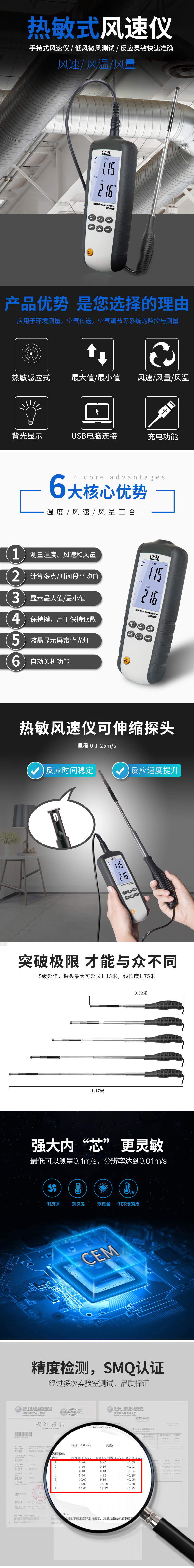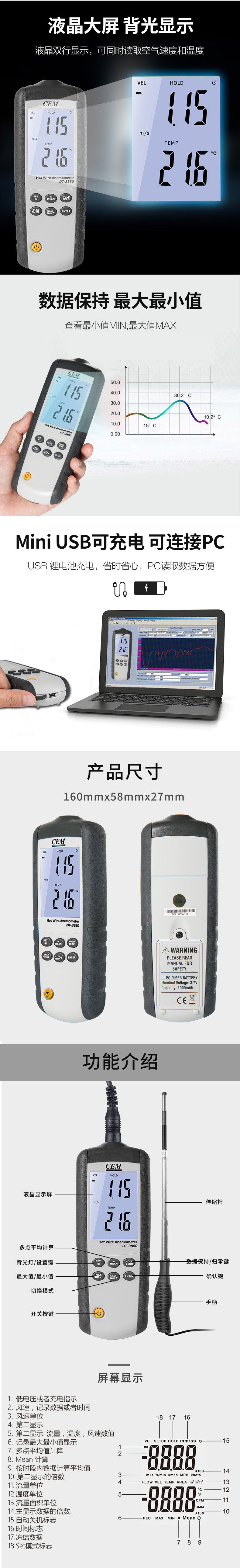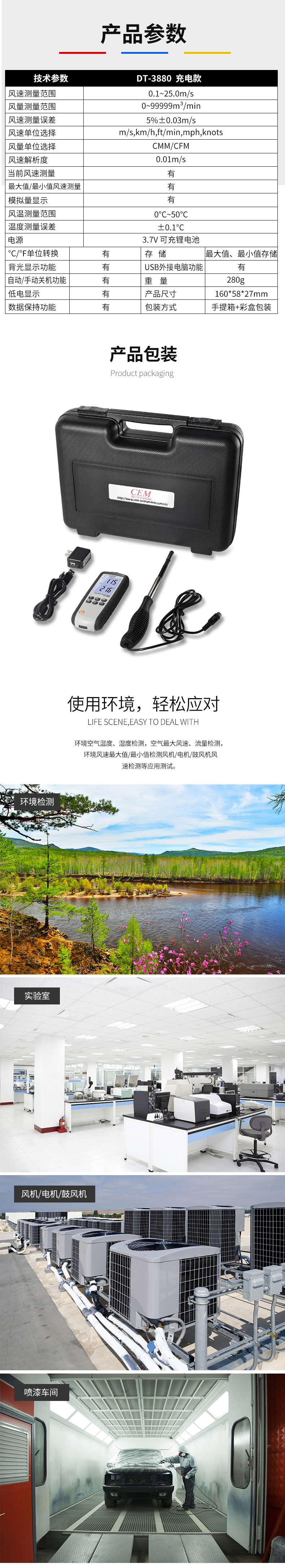 DT-3880熱敏式風(fēng)速儀是CEM新推出的一款性能穩(wěn)定、高精度、帶可充電鋰電池的熱敏式風(fēng)速儀,1.5M的熱敏式探頭,可測(cè)量風(fēng)速,風(fēng)溫,風(fēng)量以及環(huán)境溫度。在室內(nèi)空氣、工業(yè)健康環(huán)境、管道、暖通空調(diào)等領(lǐng)域都能發(fā)揮準(zhǔn)確測(cè)量的檢測(cè)功能。