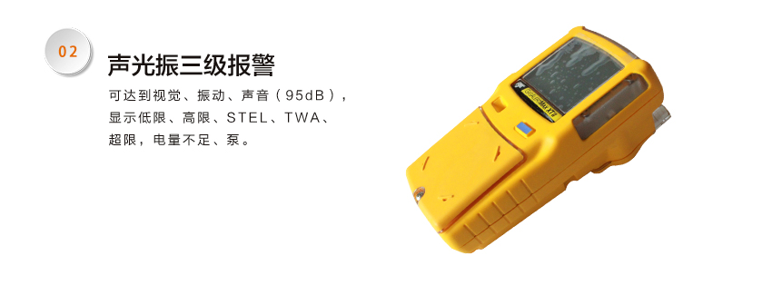4、報(bào)警:視覺(jué)、振動(dòng)、聲音(95dB),低限、高限、STEL、TWA,電量不足、泵。