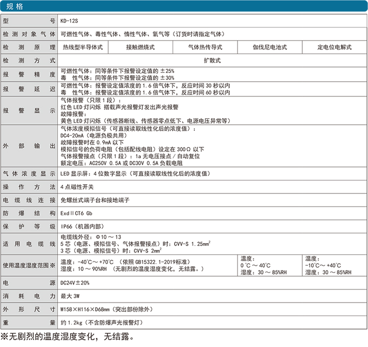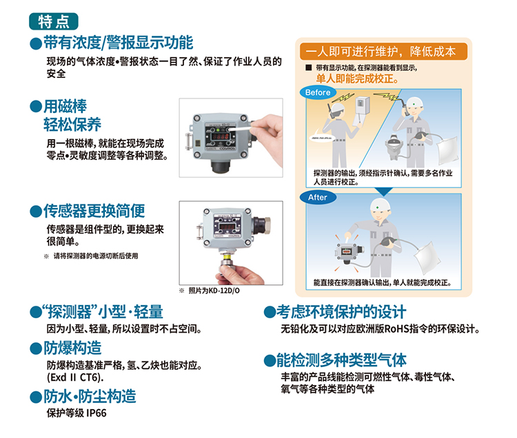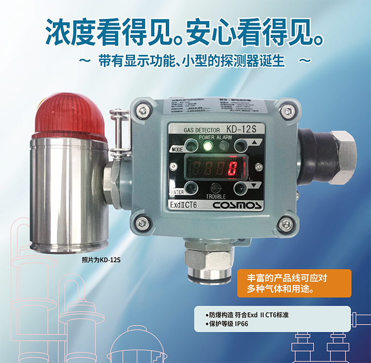 KD-12系列是一款數值顯示、聲光報警多種氣體檢測儀。殼體可搭載隔爆式聲光報警燈;帶濃度顯示功能,在現場可讀取濃度;使用磁棒操作,維護簡單;單元式傳感器,方便替換;隔爆型外殼設計 ExdII CT6;防水防塵構造 保護等級IP66;輕量化設計采用免螺絲式端子臺,接線簡單基板電子部件和焊接實現無鉛化。用于燃氣、石油化工、汽車、船舶等行業。