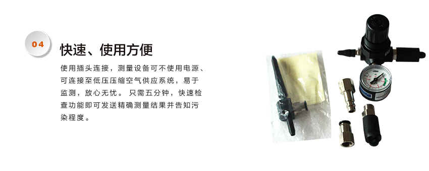 使用插頭連接,測量設(shè)備可不使用電源、可連接至低壓壓縮空氣供應(yīng)系統(tǒng),易于監(jiān)測,放心無憂。 只需五分鐘,快速檢查功能即可發(fā)送精確測量結(jié)果并告知污染程度。