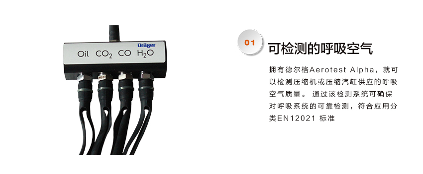 擁有德爾格Aerotest Alpha,就可以檢測壓縮機(jī)或壓縮汽缸供應(yīng)的呼吸空氣質(zhì)量。 通過該檢測系統(tǒng)可確保對呼吸系統(tǒng)的可靠檢測,符合應(yīng)用分類EN12021 標(biāo)準(zhǔn)。