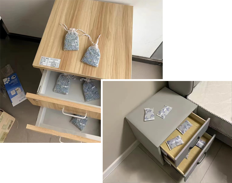 像柜子、抽屜這樣的密閉空間或者通風不好的角落,可以放一些活性炭(注意要定期更換、暴曬)或者容森巖(這個材料不飽和,不用定期更換)吸附。