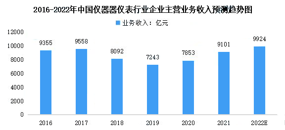 目前,我國儀器儀表行業的產品門類、品種比較齊全,布局較為合理,且已具備可觀的技術基礎和生產規模。數據顯示,我國儀器儀表行業企業主營業務收入在2016年-2017年小幅增長后下降至2019年的7243億元,在2019-2021年呈增長趨勢。隨著節能降耗、民生產業、戰略性新興產業的持續發展以及國家對食品安全和環境保護的重視程度加大,為我國儀器儀表行業帶來了新的機遇。中商產業研究院預測,2022年我國儀器儀表行業企業主營業務收入將達9924億元。