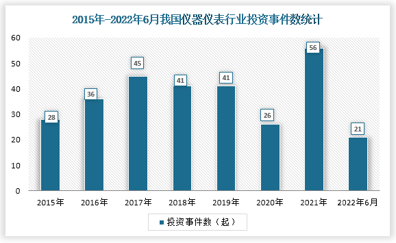 數據顯示,我國儀器儀表行業投資事件數在2016-2020年間逐年下降,2021年投資事件數19起,較前年增長了9起。截至2022年6月23日,我國儀器儀表行業投資事件數為3起。