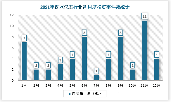 2021年我國儀器儀表行業共發生投資19起,投資金額最高的為8月,當月發生投資事件2起,已披露投資金額達16.6億元。