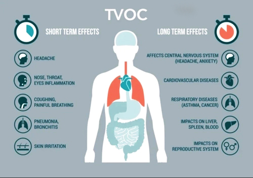 VOC有刺激性氣味,而且有些化合物具有基因毒性。TVOC能引起機體免疫水平失調,影響中樞神經系統功能,出現頭暈、頭痛、嗜睡、無力、胸悶等自覺癥狀;還可能影響消化系統,出現食欲不振、惡心等,嚴重時可損傷肝臟和造血系統,出現變態反應等。