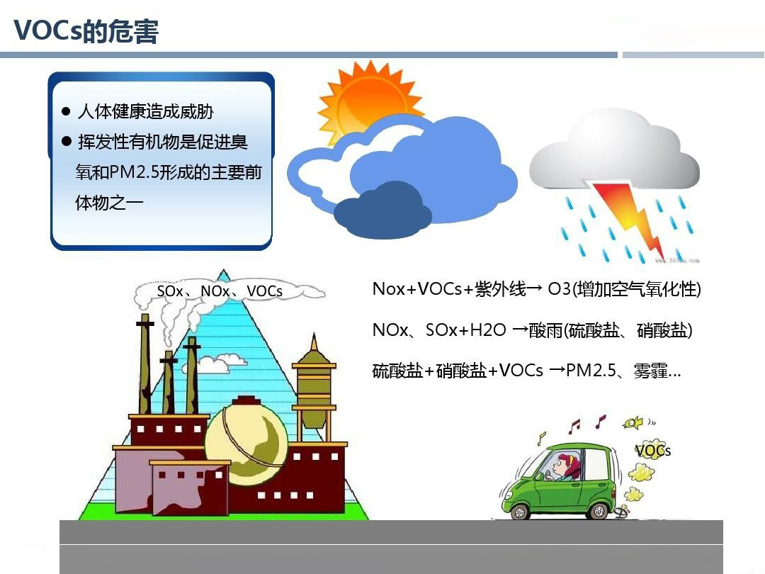 VOC室外主要來自燃料燃燒和交通運輸;室內主要來自燃煤和天然氣等燃燒產物、吸煙、采暖和烹調等得煙霧,建筑和裝飾材料、家具、家用電器、清潔劑和人體本身的排放等。
