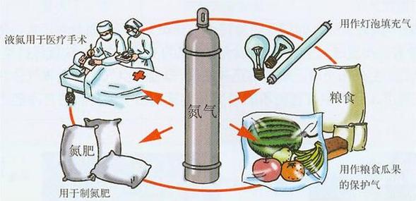 4、氮氣可用于合成一氧化氮或二氧化氮,以此來制造硝酸,這種制造方法純度高且價格較為低廉。此外氮氣還可用于合成氨及金屬氮化物等。