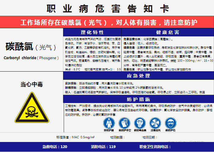 光氣,又稱碳酰氯,劇毒,微溶于水,較易溶于苯、甲苯等。由一氧化碳和氯氣的混合物通過活性炭制得。光氣常溫下為無色氣體,有腐草味,化學性質不穩定,遇水迅速水解,生成氯化氫。是氯塑料高溫熱解產物之一。用作有機合成、農藥、藥物、染料及其他化工制品的中間體。脂肪族氯烴類(如氯仿、三氯乙烯等)燃燒時可產生光氣。環境中的光氣主要來自染料、農藥、制藥等生產工藝。光氣是劇烈窒息性毒氣,高濃度吸入可致肺水腫。毒性比氯氣約大10倍,但在體內無蓄積作用。