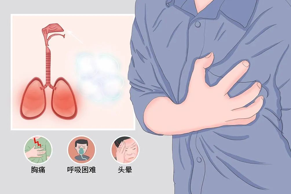 急性中毒:輕度中毒,患者有流淚、畏光、咽部不適、咳嗽、胸悶等;中度中毒,除上述癥狀加重外,患者出現輕度呼吸困難、輕度紫紺;重度中毒出現肺水腫或成人呼吸窘迫綜合征,患者劇烈咳嗽、咯大量泡沫痰、呼吸窘迫、明顯紫紺。肺水腫發生前有一段時間的癥狀緩解期(一般1-24小時)。可并發縱隔及皮下氣腫。