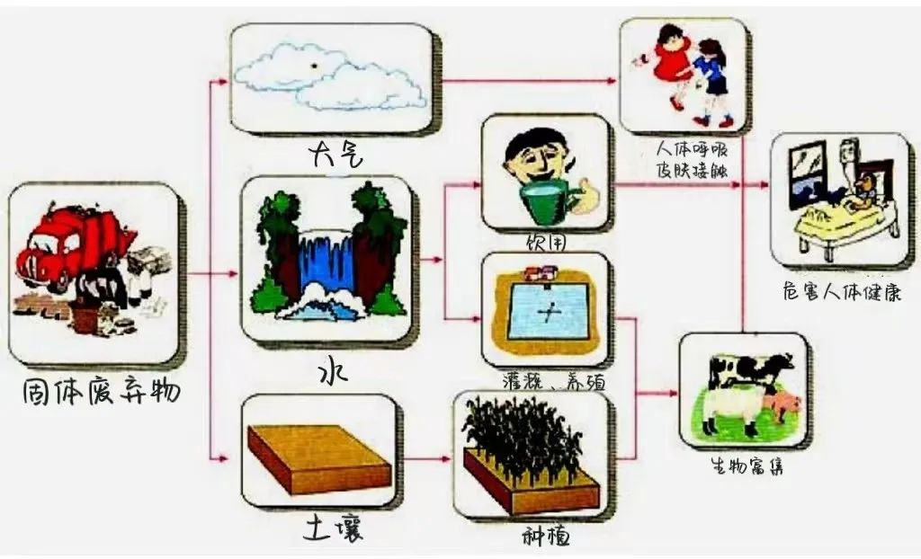 而除了上述途徑以外,有些固體廢物還可能造成燃燒、爆炸、接觸中毒、腐蝕等特殊損害。另外,側體廢物還可能通過植物和動物間接地對人類的健康造成危害,例如重金屬污染等。
